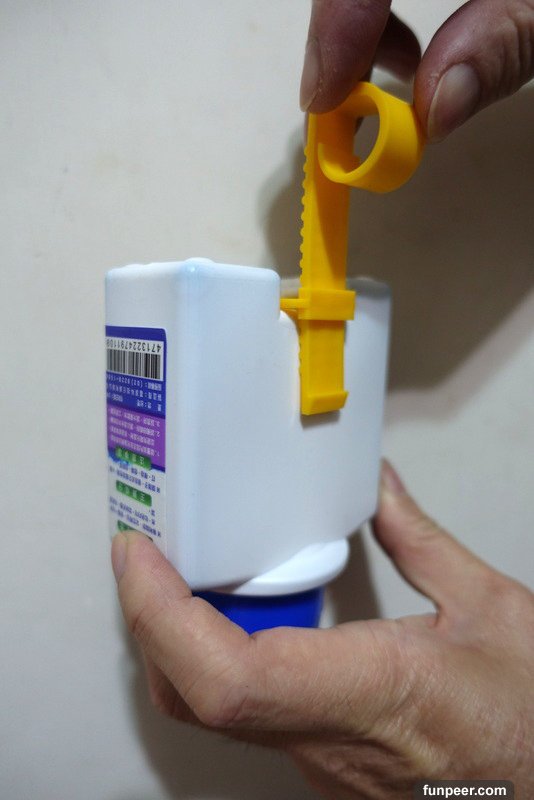 因為每款馬桶的設計都不同,倒掛時要注意應該要掛在水箱的內側,以不妨礙浮球和放水匣為原則,調整掛勾高度時只要讓整個水位蓋過下方蓋子就可以了。但要特別注意,不要超過瓶身的1/3,避免造成水壓回流的現象。