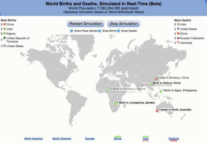 10. Death Map:這個死亡地圖會查詢的到在任何時間、地點的死亡事件。進入網站後,用戶會看到世界地圖,不久之後,紅點就會開始出現,這就代表著那個地區有人死亡,但是死亡地圖中也會有代表出生的綠點。令人感到恐怖的是,如果你點擊紅點,它會顯示死者的宗教信仰跟一些資訊,令人毛毛的記錄…