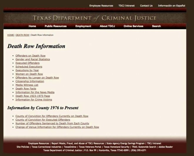 6. Death Row Information:這個網站的所有信息都來自德州刑事司法部,網站上包括了所有死刑犯相關的資訊,像說過去處決的記錄和死刑犯最後的話,還可以知道目前在死囚牢房的犯人列表資料。