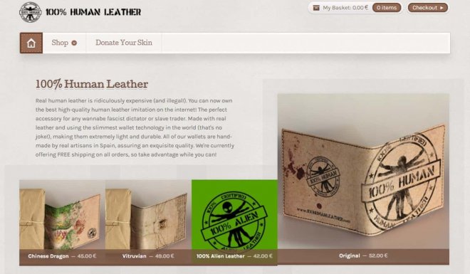 1. Human Leather:這個名為「人類皮革」的網站,銷售的產品真的都是從人皮製成。你可能會想問這些人皮來自哪裡?網站的回答是「這些人皮都是一般人身上的,有些是在死前已經將皮膚捐贈給我們的」,但是誰會想把自己的皮膚捐給這個網站?又是誰在製造這些產品?最重要的是誰買了他們?!