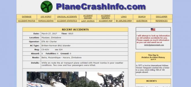 14. Plane Crash Info:這個網站可能是清單中最令人難過的網站之一。因為網站設立是讓用戶提供飛機事故統計、報告、地圖、照片等等,甚至還有事件中最後罹難者說的最後一個字。這是一個非常震撼人心的網站,而且網站還有詳細記錄飛機在空中的最後時刻、飛行員的命令、乘客的話、以及飛機撞毀的時刻。