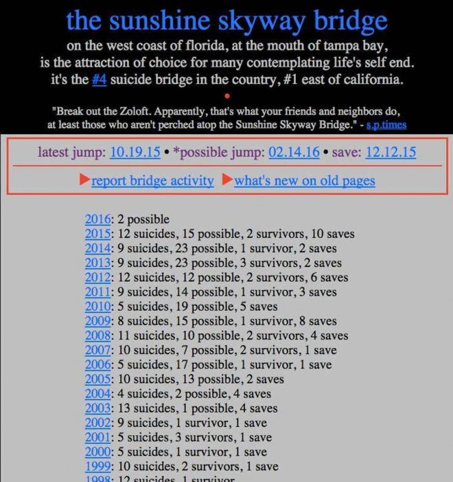 3. Skyway Bridge:這是美國最受著名的自殺橋 (Sunshine Skyway Bridge)。這網站可以看到所有在橋上試圖自殺的人、成功死亡的人、存活者跟被救的人等等…
