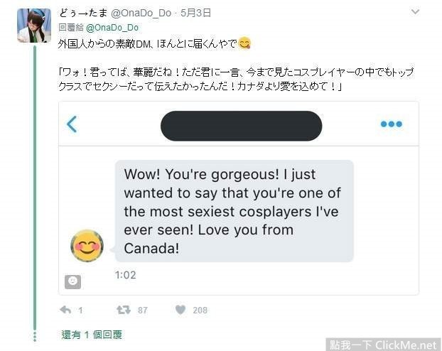 ▼『哇!妳好棒,我只想跟妳說妳是最性感的COSER,我從來沒有見過!來自加大拿的粉絲』