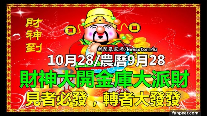 今天是10月28/農曆9月28 今天是大發日,60年一次!財神大開金庫大派財!見者必發,轉者大發發!誰打開,誰先發發發!