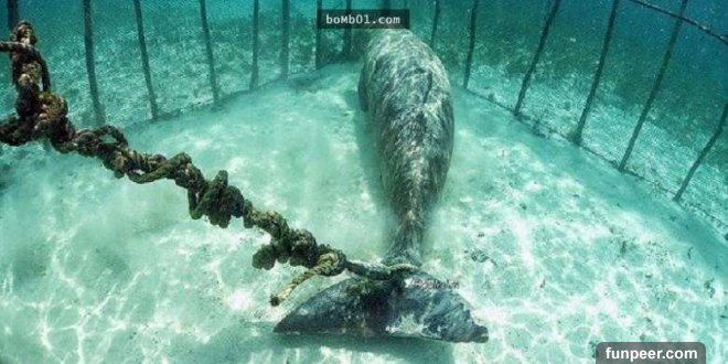 (圖片翻攝自:bomb01 下同▼經過詢問後才知道,當地的漁夫為了要招攬觀光客的生意,將這隻儒艮綁在海底,然後跟遊客收取費用跟儒艮拍照,而這隻儒艮因為想要掙脫逃走,身上被籠子跟繩索弄得滿身是傷。