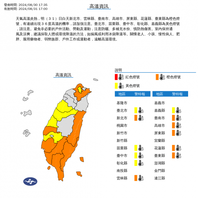 關於今日的氣溫預測,北部、東部地區約落在23至37度之間,中部、南部地區則為25至36度之間。此外,氣象署也針對新北市、雲林縣、臺南市、高雄市、屏東縣、花蓮縣、台東縣等縣市,發布連續36度高溫所代表的「橙色燈號」。而北市、苗栗縣、台中市、彰化縣、嘉義縣等地則為「黃色燈號」。