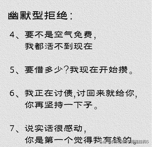 第三種是「幽默型拒絕」,用幽默的方式先自嘲一番,也可以順勢化解不借錢的尷尬:
