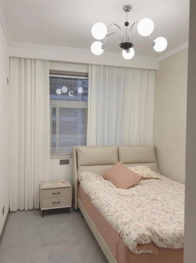 那如何解決呢?要麼,就是只能做短款的窗帘;要麼,就是把窗帘,強行塞進床頭的那個縫兒里。但不論採用哪種方式,都不是最佳方案;前者美觀度不足,後者會導致窗帘髒兮兮的。